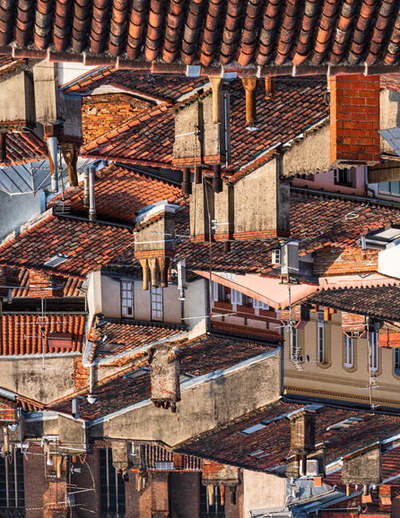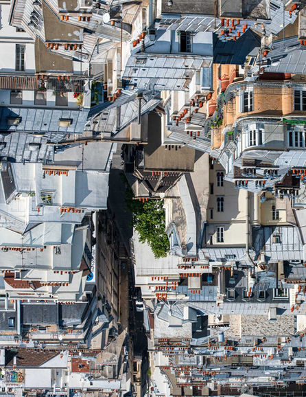 Contrairement à ce que l'on pourrait croire, il ne s'agit pas de collage, de découpage ou d’images générées à l’aide de l’intelligence artificielle. Il ne s’agit que de la réalité. Je retourne simplement la photographie et je travaille assez précisément sur le cadrage. Au premier coup d’œil, on cherche instinctivement à se raccrocher à la réalité en recherchant des repères visuels. Notre regard se fixe sur certains éléments et la compréhension de l’image devient de plus en plus complexe. Au bout de quelques instants, le cerveau définit de nouveaux repères et une nouvelle image apparaît. La concentration de bâtiments, l’accumulation de toits imbriqués, la cohabitation d’architectures anciennes et modernes, les jeux de formes, d’ombres, de matières, de couleurs, donnent une esthétique de la ville à la fois familière et renouvelée.
